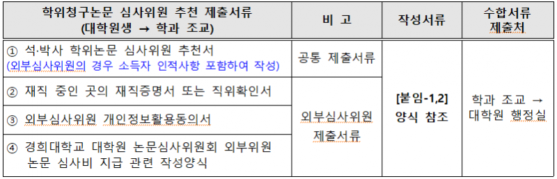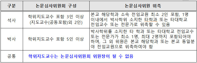 3) 논문심사위원 위촉 불가 교원 : 겸임교수, 객원교수, 초빙교수, 학술연구교수, 석좌교수, 시간강사, 명예특임교수, 특임교수, 산학협력중점교수 등 비전임교원은 논문심사위원으로 위촉 불가