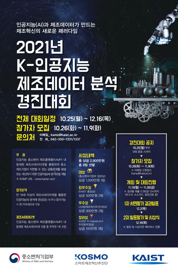 중소벤처기업부에서 「2021년도 K-인공지능 제조데이터 분석 경진대회」를 개최하오니,