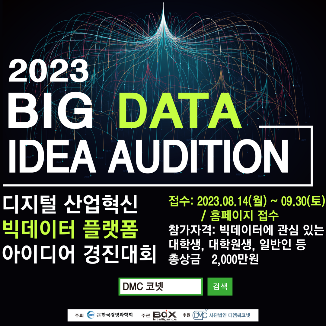 (사)디엠씨코넷에서 후원하는 『2023년 DMC 빅데이터 아이디어 오디션』을 개최합니다.
