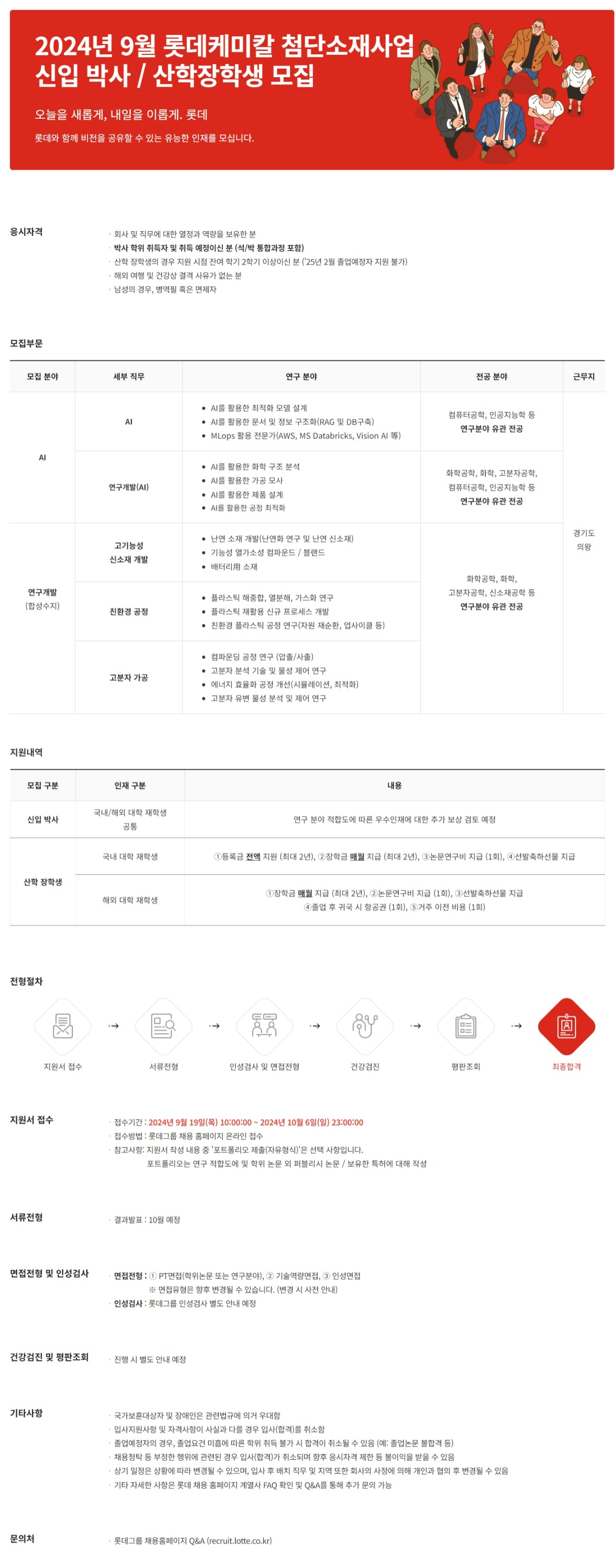 롯데케미칼 첨단소재사업 2024년 9월 신입 박사 / 산학장학생 모집
