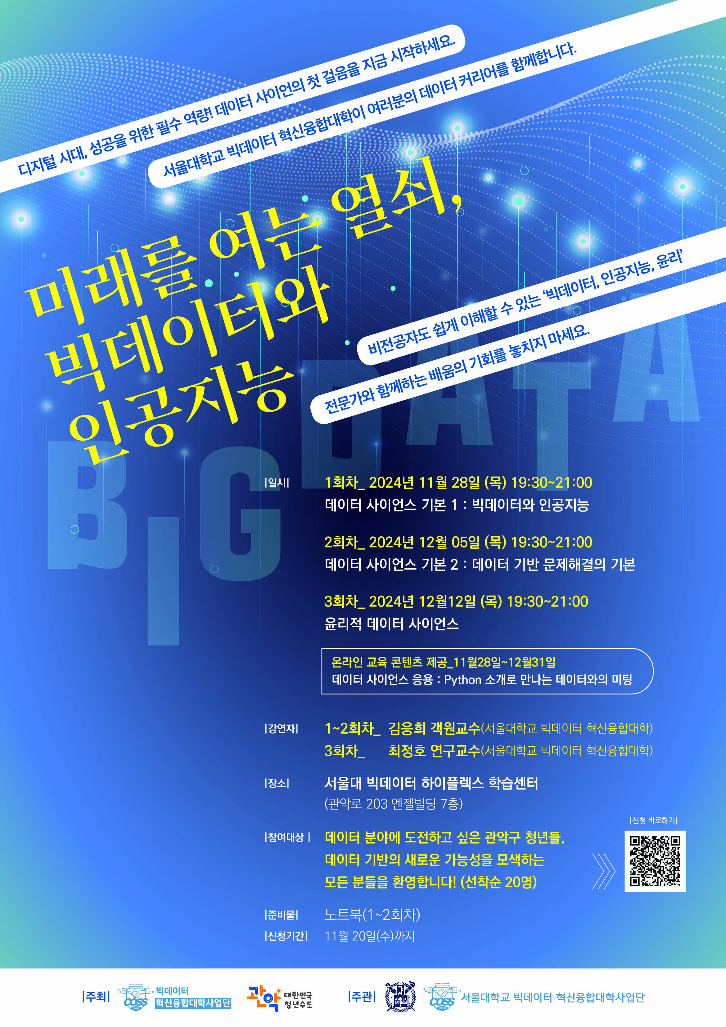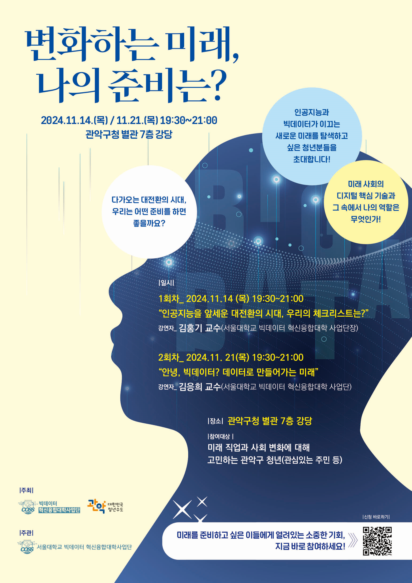 관악구와 서울대학교 빅데이터 혁신융합대학사업단이 협업하여 취·창업을 준비중인 청년들을 위한 빅데이터 및 AI분야 강연 및 교육 추진을 안내드립니다.
