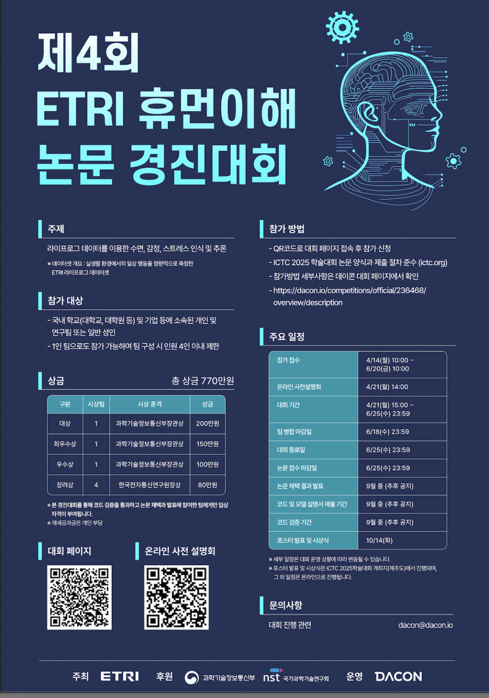 - 참가자는 사람의 라이프로그 데이터를 활용하여 예측 AI 모델을 개발하고 관련 연구자료를 바탕으로 6-page full paper를 작성하여 ICTC 2025 학회에 투고하는 특별한 경진대회
