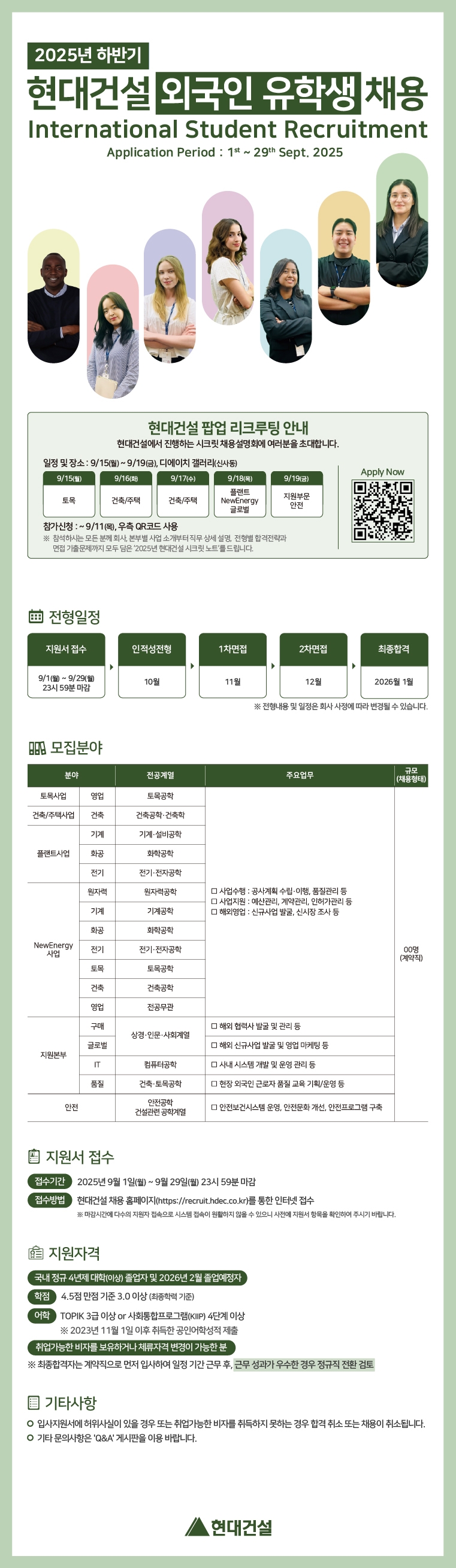 [홍보] [현대건설/외국인전형] 2025년 9월 현대건설 신입사원 채용 (~9/29(월)까지)