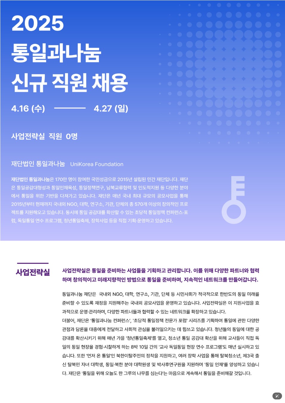 [공통] [(재)통일과나눔] 사업전략실 신규 직원 채용(~4/27)