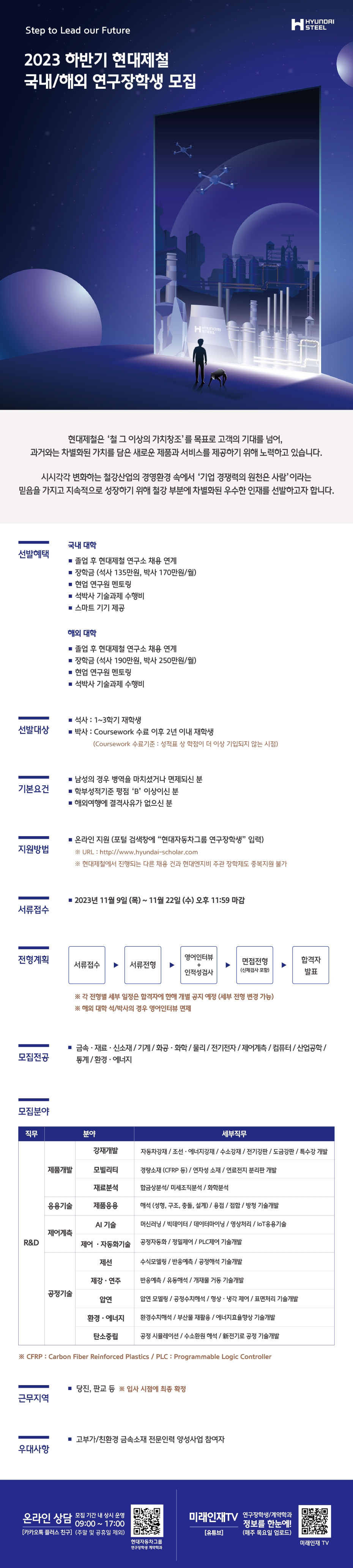 [현대제철] 2023 하반기 현대제철 국내/해외 연구장학생 모집(~11/22(수))